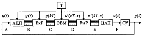 Функциональная схема содержит АЦП, входным сигналом которого является непрерывный сигнал y(t) (точка А), а выходным кусочно-постоянный сигнал ỹ(t) = y(kT) (точка В), который поступает на вход следующего блока - входного регистра ВхР. Выходом последнего служит шина управляющей ЭВМ (точка С), на которой в моменты ввода информации t = kT появляется импульсный сигнал y(kT). Таким образом, первые два блока системы преобразуют непрерывный сигнал y(t) в квантованный по времени дискретный сигнал y(kT), т. е. представляют собой квантователь, при этом эффект квантования вызван периодическими обращениями ЭВМ к входному регистру.