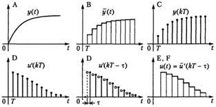 Дискретный сигнал y(kT) поступает в процессор ЭВМ, где производится расчет текущих значений управляющего воздействия. В идеальном случае на выходе ЭВМ (точка D) мгновенно формируется дискретный сигнал u'(kT). С учетом запаздывания - смещенная импульсная последовательность u'(kT-t), где t<Т, или, полагая для простоты t=Т, сигнал u'((k-1)T).