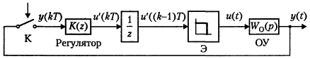 (p), цифровой регулятор с передаточной функцией K(z), квантователь К, элемент задержки l/z и экстраполятор Э. В общем случае модель может включать каналы задающих воздействий и обратные связи по различным переменным системы.