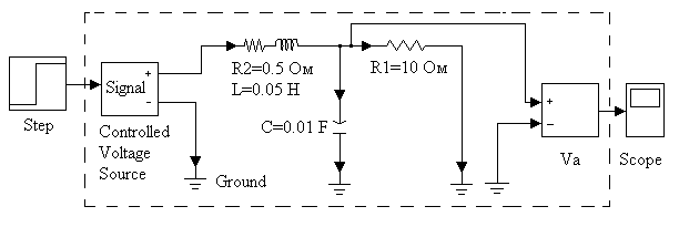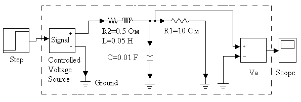 В качестве примера на рисунке 5.6. представлена схема набора модели для получения переходной функции простой электрической цепи в пакете SimPowerSystems. Часть рисунка, обведенная пунктиром, относится к энергетической части схемы, и включает элементы, передающие мощность. Эти элементы входят в библиотеки SimPowerSystems. Модель ступенчатого входного воздействия (Step) и модель индикатора (Scope) взяты из библиотек Simulink. В результате, источник постоянного напряжения управляется входным сигналом. Выходное напряжение также преобразуется в сигнал и подается на индикатор. Блоки управляемого источника и измерителя выполняют роль интерфейсов между информационной и энергетической частями модели.