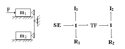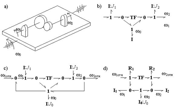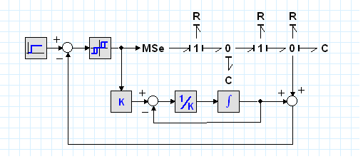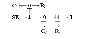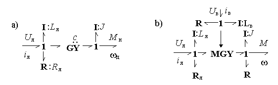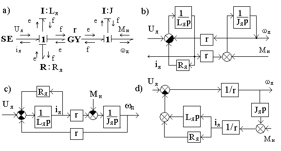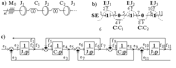 Библиотеки базовых компонентов включают: библиотеку типовых одномерных направленных звеньев – источников, измерителей, преобразователей, блоков математических операций и т.д.; библиотеку элементов графов связей, как простейших универсальных энергетических компонентов; библиотеки механических, электрических, гидравлических, тепловых элементов. В качестве примера на рис. 5.4 представлена модель системы, где энергетическая часть представлена графом связей, а управляющая – блок-схемой, включающей направленные звенья.