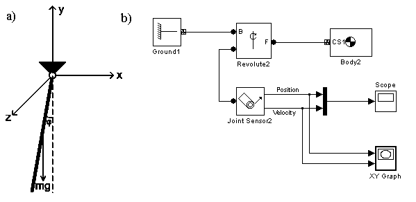 На рисунке 5.5 приведена блок-схема простейшей механической системы (маятника), включающая такие физические компоненты как блок тела (body), блок одномерного вращательного движения (revolute), блок основания (ground).