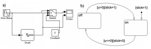 Обычно, при моделировании мехатронных систем, SF-диаграмма встроена в Simulink-модель и работает совместно с ней, обмениваясь сигналами (данные, события) через интерфейс. На рис. 5.7. показана схема, в которой источник переменного напряжения подключен к нагрузке – осциллографу через управляемый коммутатор. Переключатель должен работать следующим образом. При положительном напряжении на выходе генератора, он должен подключать это напряжение на вход индикатора. Если напряжение становится меньше нуля, на индикатор должен передаваться сигнал, равный 2.