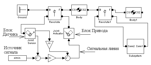 Связи между основными компонентами SimMechanics, твердыми телами и кинематическими парами, имеют энергетический векторный характер. Они могут включать линейные и угловые скорости, силы, моменты и перемещения. К телам и кинематическим парам могут подключаться компоненты, играющие роль приводов и датчиков. Через эти компоненты на механическую систему могут быть поданы внешние воздействия. Через них же механическая часть может быть подключена к информационно-управляющей системе, для моделирования которой может быть использован пакет Simulink.