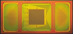 Увеличенное изображение экспериментального чипа Millipede. В центре — массив микроприводов размером 3×3 мм (общий размер чипа — 7×14 мм)
