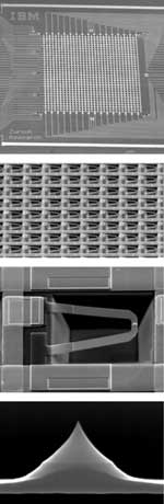 Увеличенные изображения экспериментального чипа Millipede, сделанные при помощи электронного микроскопа (сверху вниз): массив микроприводов, фрагмент массива микроприводов, отдельный микропривод, игла микропривода (вид сбоку)