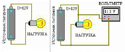 Подключим к источнику питания лампочку. Всякий электрический прибор, подключенный к источнику питания, называется нагрузкой. Если на нагрузке измерить напряжение, то может оказаться так, что вольтметр покажет напряжение ниже, чем должен давать источник питания (смотрите рисунок). Это не ошибка показаний вольтметра, а просто у источника питания недостаточно энергии для питания нагрузки.
