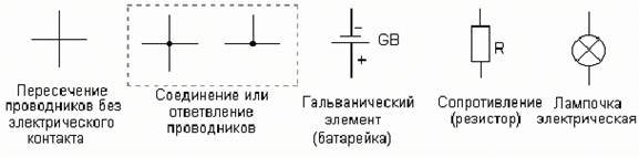 Для изображения на электрических схемах различных радио и электронных деталей приняты условные обозначения. Некоторые из них показаны на рисунке. В последующих уроках мы будем пользоваться только такими обозначениями: