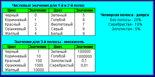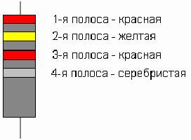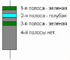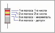 Обычно резистор имеет четыре цветные полосы. Первая полоса всегда находится ближе к краю корпуса резистора (смотрите рисунок). Каждая полоса на резисторе имеет свое определенное назначение: