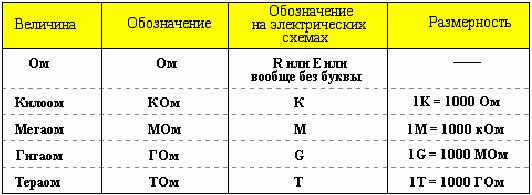 Вы наверно обратили внимание, что рассчитанные нами номиналы сопротивления резисторов имеют слишком большую размерность. Для удобной записи величины сопротивлений применяют кратные величины, которые перечислены в приводимой таблице.