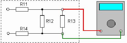 Найдите на учебном модуле фрагмент схемы, показанный на рисунке. Обратите внимание, что резисторы R12 и R13 включены параллельно, поэтому мы не сможем измерить сопротивления R12 и R13 раздельно, а только их общее сопротивление. Мы можем по цветным полосам определить их сопротивление, затем, по формуле, найти их общее сопротивление и сравнить его с измеренным значением.