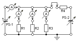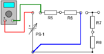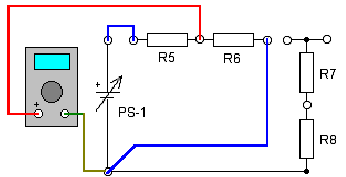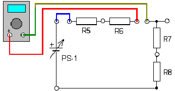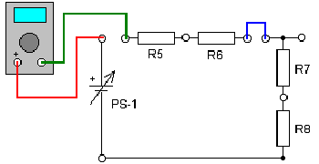 Соберите схему, показанную на рисунке. Измерьте напряжение Ur8 на резисторе R8 (точка А), оно должно совпадать с расчетным. Затем вам нужно измерить напряжение в точке Б, оно будет равно: Ur8+Ur7 = 1,2+3,8 = 5В. И последним нужно измерить напряжение в точке В. Напряжение в точке В будет равно: Ur8+Ur7+Ur6 = 5 + 5,4 = 10,4 вольта.