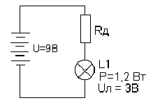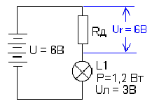 Мы не знаем величину сопротивления резистора Rд, поэтому ее нужно рассчитать. Сначала определим ток, проходящий через лампу. В нашем распоряжении есть две величины: Мощность лампы - P = 1.2Вт и рабочее напряжение лампы Uл = 3В. Вспомним формулу расчета мощности P = U*I. Отсюда можем найти ток через лампу Iл = P/Uл = 1.2Вт/3В = 0,4А. Мы знаем, что при последовательном включении сопротивлений (лампа в данном случае является сопротивлением), ток в любой точке цепи – величина постоянная. Задача дополнительного резистора Rд снизить величину напряжения с 9 вольт до 3 вольт, то есть напряжение в цепи должно распределиться так: 3 вольта на лампе и 6 вольт Ur на сопротивлении Rд.