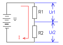 Рассмотрим цепь из двух включенных последовательно резисторов. Расчет делителя, обычно производится для заданного тока через нагрузку. В качестве нагрузки обычно используется резистор R2 показанный на нашем рисунке.