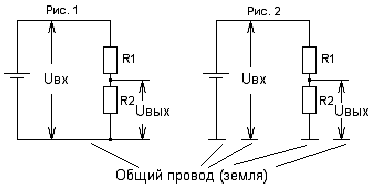 Принято говорить о выходном напряжении делителя относительно общего провода. Общий провод еще называют "землей" или "корпусом". Чаще всего общим проводом является минус источника питания. Соединение деталей подключенных к общему проводу, на электрической схеме можно не указывать, а ставить знак "корпус". Схемы на рисунках 1 и 2 одинаковы.