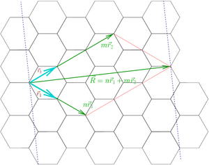 , задающими разложение направления сворачивания на вектора трансляции графитовой решётки. Это проиллюстрировано на рисунке справа.