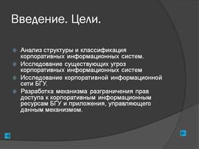 Данная работа ставит перед собой несколько целей. Одной из них является анализ структуры корпоративных информационных систем. На основе этого анализа будет проведена их классификация. Также одной из целей данной работы является исследование механизмов защиты данных в различных классах корпоративных информационных систем. Кроме того, ставится цель исследовать существующие угрозы корпоративных информационных систем и проанализировать методы их минимизации или полного устранения. В связи с этим будет проведено исследование существующих способов разграничения доступа и анализ их применимости тех или иных условиях.