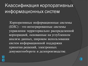 Корпоративные информационные системы (КИС) – это интегрированные системы управления территориально распределенной корпорацией, основанные на углубленном анализе данных, широком использовании систем информационной поддержки принятия решений, электронных документообороте и делопроизводстве.