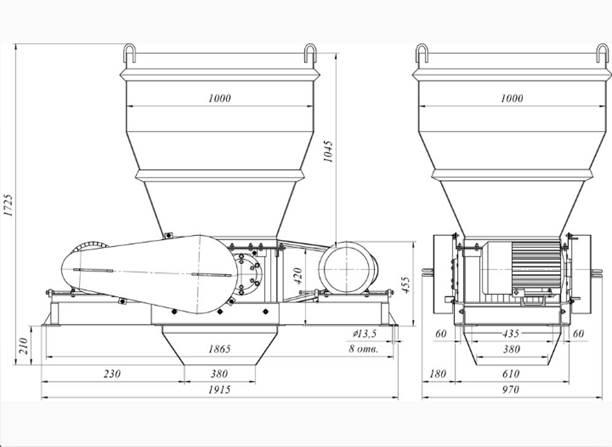 /ч. Привод осуществляется от электродвигателей посредством ременных передач. Валы с набором дисков, далее роторы, крепятся в подшипниковых опорах, расположенных в корпусе. Электродвигатели и корпус установлены на общей раме. Загрузка исходного материала происходит в бункер. В корпусе измельчителя установлена решетка, а в нижней части рамы крепится разгрузочное устройство через которое осуществляется разгрузка материала в транспортную тару или на транспортную систему. Наружные вращающиеся части ограждены кожухами (См. Рис. 5).