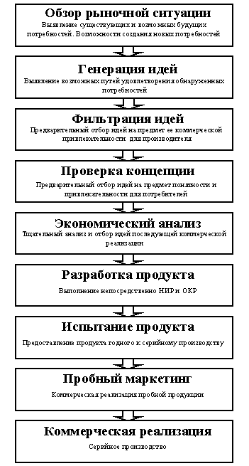 Проверка концепции подразумевает формирование обратной связи с потребителями. Это позволяет представить потребителю предлагаемый товар, оценить его отношение к нему и намерение сделать покупку. Экономический анализ оставшихся идей продукта достаточно детализован, так как следующий этап – дорогая и длительная разработка продукции – научно-исследовательские работы (НИР) и опытно-конструкторские работы (ОКР). Поэтому экономический анализ позволяет вовремя устранить малоэффективные варианты из дальнейшего рассмотрения. Этапы разработки продукта и испытания регламентированы ГОСТ 15.101-80 «Порядок проведения НИР» и ГОСТ 15.001-73 «Основные этапы ОКР» и представляют собой длительный процесс непосредственно научных исследований, разработки конструкторской документации и проведение системы испытаний с привлечением значительной доли ресурсов компании. Пробный маркетинг дает возможность оценки продвижения и распределения продукта в небольших масштабах. Он предоставляет дополнительную информацию в преддверии коммерческой реализации и может значительно повысить вероятность ее успеха. Следует отметить, что даже на этой поздней стадии половина разработанных товаров не удовлетворяет критерию годности для выпуска в национальных масштабах. В случае принятия потребителями нового продукта и проведения грамотной маркетинговой политики, коммерческая реализация разработанного продукта может считаться успешной.