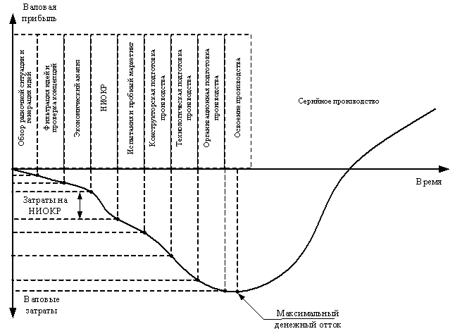 Зарождение идеи и концепции возможного использования новых научных результатов происходит на этапе фундаментальных и прикладных исследований. Причем если фундаментальные исследования – базис всех инновационных процессов, источник новых знаний, то прообраз технической и технологической инновации формируется на этапе поисковых исследований при разработке концепции и оценке ее технической осуществимости. Процесс практического воплощения идеи в действующий прототип нового продукта или технологии происходит на этапе прикладных исследований и разработок. Данный этап в свою очередь включает две фазы: научно-исследовательскую, когда происходит конструкторская проработка, и опытно-конструкторскую, в ходе которой создается полномасштабный прототип и проводится его испытание.