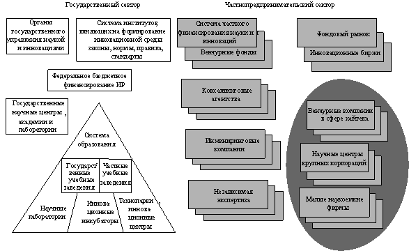 Ключевой проблемой стратегии развития национальных и региональных инновационных систем в РФ является, таким образом, формирование целостной инновационной инфраструктуры коммерциализации инновационных продуктов и услуг, включающей институты защиты прав интеллектуальной собственности и страхования рисков, финансовой, маркетинговой, консалтинговой, информационной и кадровой поддержки инновационной деятельности крупных компаний. Важная роль в инновационной системе должна быть отведена использованию механизма частно-государственного партнерства. Часть прикладных исследований и создание инновационной инфраструктуры может осуществляться с участием бизнеса, а технологическая модернизация - преимущественно самим бизнесом.