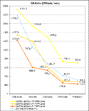 Некорректный вывод 64 пикселов на скорость отрисовки всего изображения практически не влияет. При разгоне видеокарта категорически порадовала: максимальные частоты графического процессора и видеопамяти, при которых плата работала устойчиво, составили 390/700 МГц, то есть, частота ядра выросла почти на 42%, а частота видеопамяти поднялась чуть меньше, чем на 30%. Превосходный результат разгона!