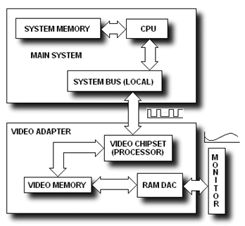 Прежде чем стать изображением на мониторе, двоичные цифровые данные обрабатываются центральным процессором, затем через шину данных направляются в видеоадаптер, где они обрабатываются и преобразуются в аналоговые данные и уже после этого направляются в монитор и формируют изображение. Сначала данные в цифровом виде из шины попадают в видеопроцессор, где они начинают обрабатываться. После этого обработанные цифровые данные направляются в видеопамять, где создается образ изображения, которое должно быть выведено на дисплее. Затем, все еще в цифровом формате, данные, образующие образ, передаются в RAMDAC, где они конвертируются в аналоговый вид, после чего передаются в монитор, на котором выводится требуемое изображение. Таким образом, почти на всем пути следования цифровых данных над ними производятся различные операции преобразования, сжатия и хранения. Оптимизируя эти операции, можно добиться повышения производительности всей видеоподсистемы. Лишь последний отрезок пути, от RAMDAC до монитора, когда данные имеют аналоговый вид, нельзя оптимизировать.