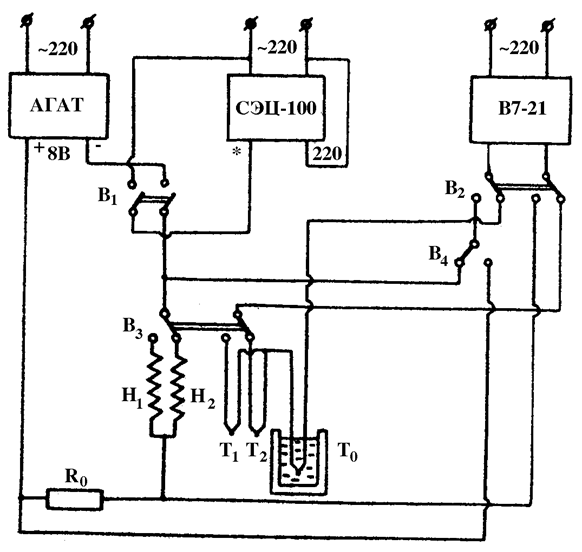 ÀÃÀÒ - ðåãóëèðóåìûé ïðèáîð ïèòàíèÿ; ÑÝÖ-100 - ñåêóíäîìåð ýëåêòðîííûé öèôðîâîé; Â7-21 - öèôðîâîé âîëüòìåòð; Í1,Í2 - ïðîâîëî÷íûå íàãðåâàòåëè; Rî - îáðàçöîâîå ñîïðîòèâëåíèå; Ò1,Ò2 - ãîðÿ÷èå ñïàè òåðìîïàð; Òî - òåðìîñòàò