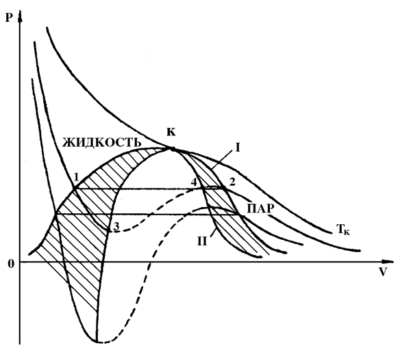 I-áèíîäàëü, ãðàíèöà äâóõôàçíûõ ðàâíîâåñíûõ ñîñòîÿíèé ñèñòåìû; II - ñïèíîäàëü, ãåîìåòðè÷åñêîå ìåñòî ìàêñèìóìîâ (ñïðàâà) ìèíèìóìîâ (ñëåâà) èçîòåðì è ãðàíèöà, îòäåëÿþùàÿ îáëàñòü ìåòàñòàáèëüíûõ ñîñòîÿíèé îò íåóñòîé÷èâûõ (âíóòðè ñïèíîäàëè); Ê - êðèòè÷åñêàÿ òî÷êà; çàøòðèõîâàíà îáëàñòü ìåòàñòàáèëüíûõ ñîñòîÿíèé.