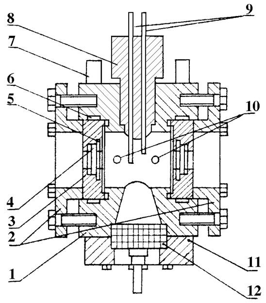 Êàìåðà âûñîêîãî äàâëåíèÿ èç óãëåðîäèñòîé ñòàëè ïðåä-ñòàâëÿåò ñîáîé òåðìîñòàòèðóåìûé ïàðàëëåëåïèïåä ðàçìåðàìè 130õ130õ110 ìì ñ öèëèíäðè÷åñêèì îáúåìîì 50 ìì è =50 ìì. Ðàçðåç êàìåðû âåðòèêàëüíîé ïëîñêîñòüþ äàí íà ðèñ.1.2. Ïðîòèâîïîëîæíûå áîêîâûå ãðàíè êîðïóñà êàìåðû èìåþò ãíåçäà äëÿ îïðàâ 3 ñî ñìîòðîâûìè ñòåêëàìè 4.  îïðàâàõ ñòåêëà óïëîòíÿþòñÿ ÷åðåç êîëüöåâûå ïðîêëàäêè ãàéêàìè 5.  âåðõíþþ ãðàíü êàìåðû ââèí÷èâàåòñÿ ìåòàëëè÷åñêàÿ ïðîáêà 8 ñ êàïèëëÿðàìè 9 (2,5 ìì) äëÿ òåðìîïàð.  íèæíåé ãðàíè êàìåðû âñòàâëÿåòñÿ òåêñòîëèòîâàÿ ïðîáêà 11, óïëîòíÿåìàÿ ôëàíöåì 12. Êîðïóñ êàìåðû 1 èìååò øåñòü âåðòèêàëüíûõ ñêâîçíûõ êàíàëîâ 7 è äâà êîëüöåâûõ 6. Ðàáî÷èé îáúåì êàìåðû çàïîëíåí ÷åðåç îäèí èç êàíàëîâ 10 î÷èùåííîé äâóîêèñüþ óãëåðîäà.