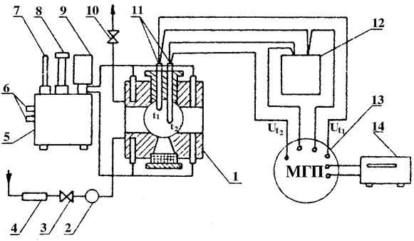 Äëÿ èçìåðåíèÿ òåìïåðàòóðû äâóîêèñè óãëåðîäà èñïîëüçó-þòñÿ ìåäü-êîíñòàíòàíîâûå òåðìîïàðû 11 (0,1 ìì), ïîìå-ùåííûå íà ðàçíûõ âûñîòàõ âíóòðè ðàáî÷åé êàìåðû 1. Ãîðÿ÷èå ñïàè òåðìîïàð èçîëèðîâàíû îò âíóòðåííåé ïîâåðõ-íîñòè êàïèëëÿðîâ, ÷òîáû èçáåæàòü âîçìîæíûõ íàâîäîê â ñõåìå èçìåðåíèÿ òåìïåðàòóðû. Õîëîäíûå ñïàè ïîìåùåíû â ñîñóä Äüþàðà ñ òàþùèì ëüäîì 12. ÝÄÑ òåðìîïàð (Ut1,Ut2) èçìåðÿþòñÿ óíèâåðñàëüíûì âîëüòìåòðîì Â7-21 (14) ÷åðåç ìíîãîòî÷å÷íûé ïåðåêëþ÷àòåëü òèïà ÌÃÏ-10Ì