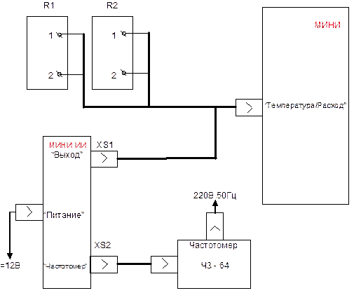 МИНИ - тепловычислитель “МИНИ ”; R1, R2 - магазин сопротивлений Р4831;