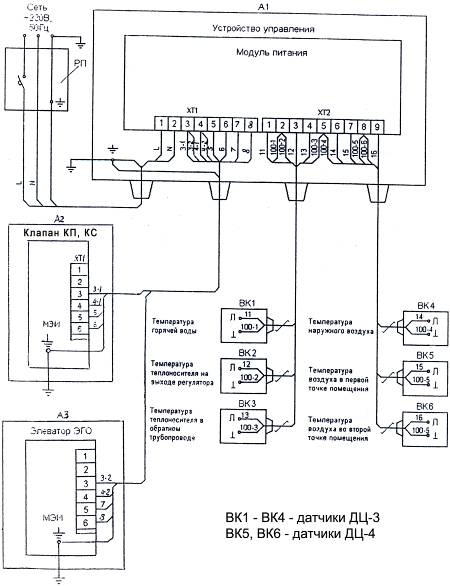 При подключении менее 5-ти датчиков в регуляторе для системы отопления установить вместо них резисторы С2-23-0,25-220 Ом между соответствующими контактами блока зажимов ХТ2.
