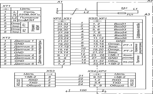 Подключение цепей внешних соединений производить строго в соответствии со схемой подключения устройства. Запрещается взаимная перемена фазного и нулевого проводников цепей напряжением 220 В, сигнального и общего проводников цепей датчиков.