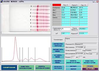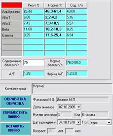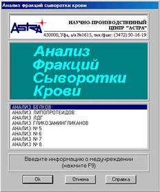 Программа “Анализ фракций сыворотки крови” зарегистрирована в РОССИЙСКОМ АГЕНТСТВЕ ПО ПРАВОВОЙ ОХРАНЕ ПРОГРАММ ДЛЯ ЭВМ, БАЗ ДАННЫХ И ТОПОЛОГИЙ ИНТЕГРАЛЬНЫЙ МИКРОСХЕМ (Свидетельство об официальной регистрации №980423).
