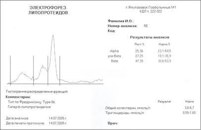 Электрофорез - это движение заряженных частиц под действием внешнего электрического поля. Основой электрофореза является разная скорость движения молекул в электрическом поле, определяемая размерами и разрядом частиц. Если нанести на ацетатцеллюлозную пленку каплю сыворотки крови и поместить пленку во внешнее электрическое поле, то в результате электрофореза на пленке останется след от движения различных фракций. Этот след представляет собой дорожку, на которой после окрашивания ясно видны места концентрации различных фракций. По этим следам (дорожкам) можно определить процентное содержание и содержание в г/л различных белковых фракций в пробе, а также тип липопротеидограмм по Фредриксону.