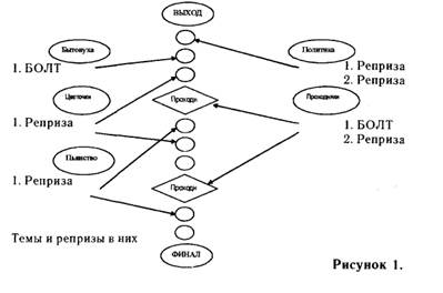 На сцену может выйти Петя Петров, без запинки прочитать по листочку два десятка шуток и, в принципе, это будет КВН, ведь КВН — жанр построенный на репризе (1), (2). Это достаточно для КВН, но не достаточно для публики, для зрителей. Где сюжет? Где раскрытие темы? Где этот праздник, на который они пришли смотреть? Поэтому умный КВНщик дает зрителю то, что ему нужно! Те же самые двадцать реприз вставляются в лже-структуры, искусственно созданные для зрителя. Пройдемся по конкурсам.