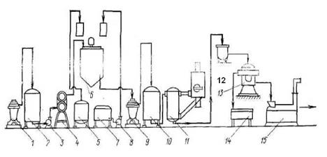 1 — сепаратор; 2,10 — промежуточные емкости; 3,8 — насосы; 4 — подогреватель; 5 — емкость хранения кислоты; 6 — ванна для сыворотки; 7 — установка для приготовления щелочного раствора; 9 — сепаратор-молокоочиститель; 11 - вакуум-выпарная установка; 12— кристаллизатор; 13 — центрифуга; 14 — емкость для мелассы; 15 — барабанная сушилка
