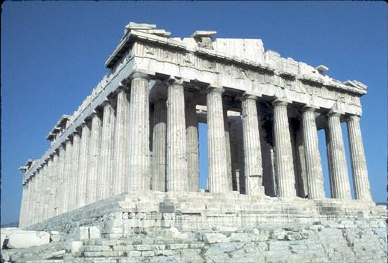 Вершина греческой архитектуры – Парфенон – храм богини Афины Парфенос (Девы), построенный в 5 веке до н.э. зодчим Иктином и Калликратом в Афинах. Его белокаменный силуэт чётко вырисовывался на фоне неба. На первый взгляд Парфенон очень прост – мраморный четырёхугольник, окружённый невысокими дорическими колоннами. И всё-таки здание бесконечно величественно. Его секрет в исключительной ритмичности и гениальной соразмерности частей. Пропорции Парфенона рассчитаны так, что человек приближаясь к нему, чувствует себя выше, шире в плечах: греки стремились к тому, чтобы архитектура вселяла в человека бодрость и внушала уверенность в себе.