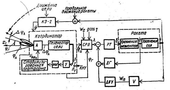Особенностью контура системы самонаведения является отличие структуры кинематического звена, характеризующего относительное сближение ракеты и цели. Это обусловлено, во-первых, тем, что координатор (измерительный элемент) и счетно-решающий прибор установлены на борту ракеты, во-вторых, реализацией в системах самонаведения двухточечных методов наведения, в соответствии с которыми определяется взаимное положение двух точек — ракеты и цели.