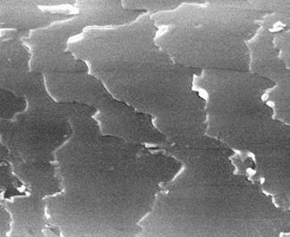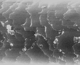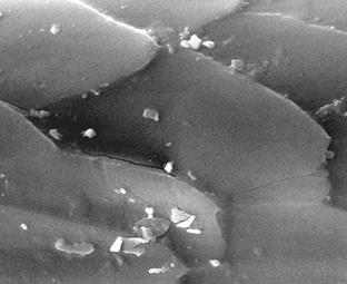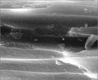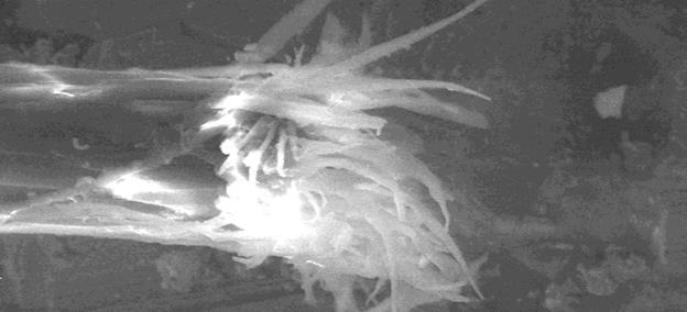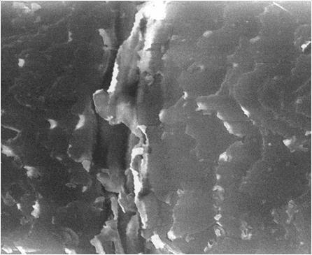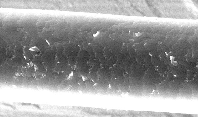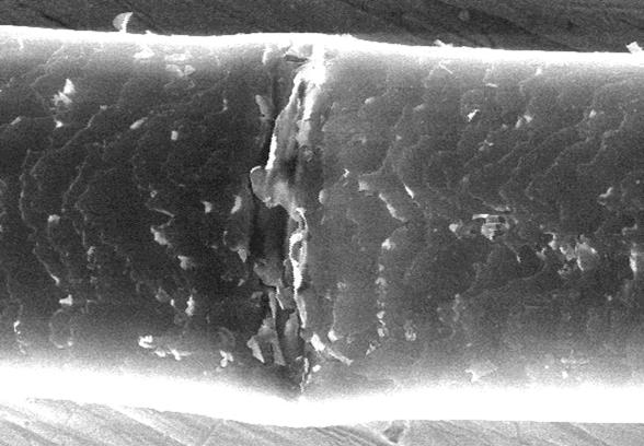 Микроскопическому исследованию были подвергнуты только поврежденные направляющие волосы и их части, выпавшие с различных участков изделия в результате встряхивания изделия над листом белой бумаги без применения каких - либо целенаправленных внешних воздействий со стороны эксперта. Выбор волос для исследования производился путем случайной выборки пяти образцов среди выпавших волос и их частей на лист белой бумаги после встряхивания изделия. Выбранные образцы волос помещались на держатель образцов и фиксировались на поверхности с помощью серебряной пасты (клея). Затем, для придания электропроводности, образцы напылялись тончайшим слоем меди (толщиной примерно 0,05 микрона) в вакуумной установке. Подготовленные таким образом образцы помещались в растровый электронный микроскоп. Съемка изображений осуществлялась с разных участков волос в диапазоне увеличений от 200 до 2000 крат, что позволило детально изучить структуру объекта. Исследованию подвергнуты четыре светлые зоны волос, так как излом волоса приходится именно на его светлый участок, и одна темная зона волоса. Светлые зоны исследуемых волос представлены на снимках №№ 1, 2, 3, 4, темная зона – на снимке № 5.