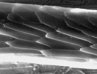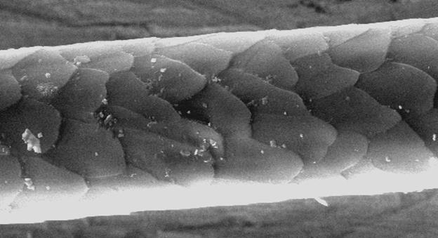 Известно, что строению волос серебристо-черной лисицы присущи правильная шишкообразная ячеистая структура кутикулы волоса и ровные края ячеек;