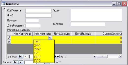3. С помощью мастера форм создайте многотабличную форму «Размещение клиентов» на основе таблиц «Клиенты» и «Расчетные карточки» (вид представления данных - подчиненный, внешний вид - табличный, стиль - стандартный, код комнаты редактируется с помощью конструктора и должен выдаваться как поле со списком).