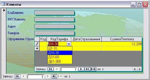 5. Создайте многотабличную форму «Клиенты», с помощью которой можно было бы на основе трех связанных таблиц фиксировать не только реквизиты клиентов, но и выбирать код тарифа из поля со списком, автоматически получая расчет суммы платежа (вид представления данных - подчиненный, внешний вид - табличный, стиль - международный):