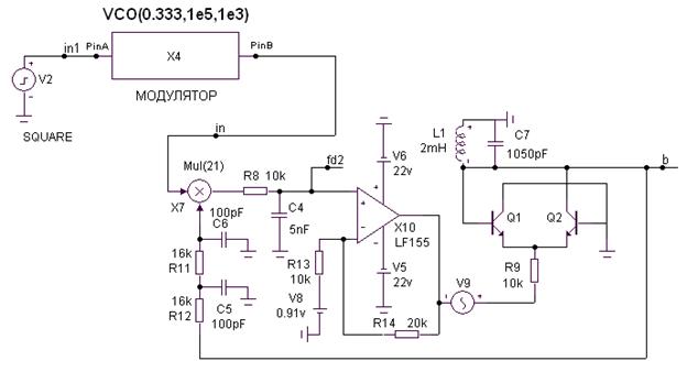– ФД (перемножитель Х7), ПФ (цепь ), ГУН (на транзисторах Q1, Q2 и ОУ Х10), фазосдвигающую цепь ( ).( При этом источник затухающего синусоидального сигнала V9 является вспомогательным и поставлен для того, чтобы ускорить процесс самовозбуждения ГУНа, который в программе Micro Cap обычно имеет большую продолжительность).