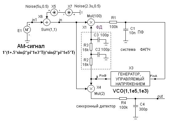 Данная схема имеет: – источник амплитудно-модулированного сигнала Е1, – источник входного шума (Noise X5, X7), – смеситель входного радиосигнала и шума (сумматор Х6), – систему ФАПЧ, выделяющую несущую частоту входного АМ сигнала, которая в свою очередь имеет ФД (перемножитель Х1), ПФ (цепь ГУН (VCO X3), фазосдвигающая цепь ( – синхронный детектор АМ сигнала (перемножитель Х4 и ФНЧ из цепи