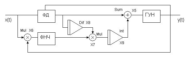 В свою очередь данная система ФАПЧ содержит: – фазовый детектор ФД (перемножитель Х1, ФНЧ – цепь фазовращающая цепь –  – набор петлевых фильтров ПФ (цепь интегратор Х9, сумматор Х13), – сумматор Х19 управляющих напряжений и , – генератор, управляемый напряжением (VCO X3), – дополнительный частотный детектор ЧД (перемножитель Х14 и его ФНЧ – цепь дифференциатор Х15, перемножитель Х16 и интегратор Х18.