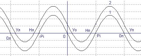 Остановимся сначала на простейшей системе ФАПЧ без петлевого фильтра и рассмотрим случай вхождения ее в синхронизм с сигналом постоянной частоты при условии и Тогда нелинейное уравнение данной системы может быть записано в виде: (9) и представлено графически на фазовой плоскости, то есть в системе координат – ось абсцисс и ось ординат (см. рис. 3). На рис. 3 нижняя кривая 1 соответствует случаю а верхняя кривая 2 – случаю, когда модуль больше нуля, но меньше величины