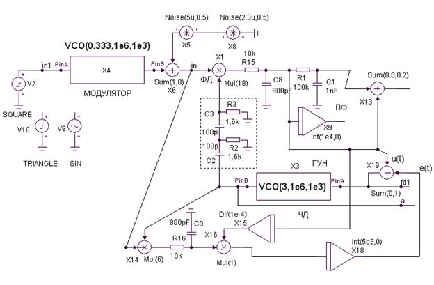 Файл Lab87_1.cir содержит схему, приведенную на рис. 5. Схема имеет: – модулятор ЧМ сигнала, состоящий из генератора, управляемого напряжением (VCO X4) и трех источников V2, V10, V9 модулирующего сигнала (меандр-SQUARE, треугольный импульс-TRIANGLE, гармонический сигнал-SIN), – источник входного шума, состоящий из двух генераторов (Noise Х5 и Х8), – смеситель входного радиосигнала и шума (сумматор Х6), – исследуемую систему ФАПЧ.
